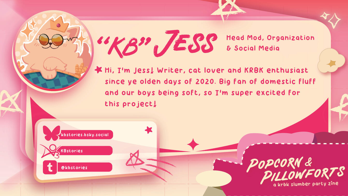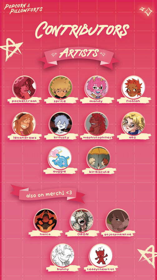 popcorn & pillowforts is of course lighthearted in nature, though some angst has snuck in. all settings - canonverse, canon divergent and alternate universes - are allowed as well as canon-typical levels of violence. sexual humor, mentions of sex and fades-to-black are fine; as a sfw zine, anything beyond that is off-limits.all headcanons re: the sexuality, romantic attraction and gender identity of kirishima and bakugou as well as background ships and poly interpretations are welcome!is ai-generated work allowed?