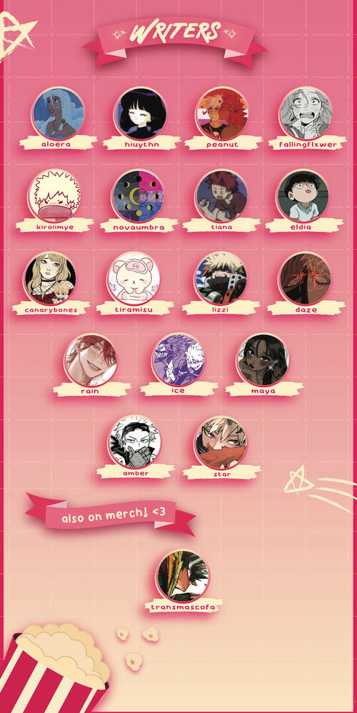 our writers contributed a maximum of 4,000 words with the possibility to split it up into two pieces. artists had a maximum of 5 pages to do with as they wish. our digital merch options ranged from discord emotes to wallpapers.what kind of content is allowed in this zine?